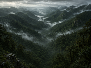 The Murkwood Highlands form the eastern enclosed highland region of Gondara, representing the surface terrain of the Murkwood Mountain System. The region is defined by continuous forest coverage, folded terrain, and restricted movement.